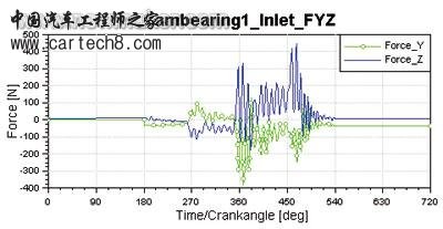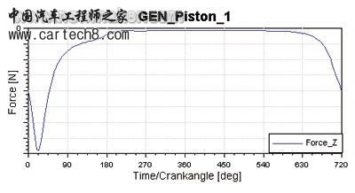 图2 发动机爆发压力图3和图4分别为第一缸的作用在活塞顶部的爆发压力载荷、进气凸轮轴对轴承座的作用力的载荷-曲轴转角历程。