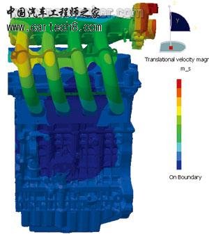 图4 进气凸轮轴对轴承座的作用力在不同的转速工况下,各种载荷的时间历程都是不同的,需要在软件中输入不同工况下的载荷曲线。 4. 发动机结构响应计算 模型搭建完成后,计算主要工况下动力总成的振动。在EXCITE中进行动力学计算后,进入NASTRAN中进行数据恢复,得到各结构的振动响应。 模型搭建完成后,计算主要转速工况下动力总成的振动加速度,主要计算工况包括1000r/min、最大扭矩转速和额定转速等。在EXCITE中进行动力学计算后,结果导入有限元软件中进行数据恢复,得到各结构的振动响应。图5所示为发动机在6 500r/min时的表面振动速度。