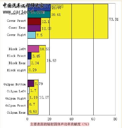 图6 转数为1 000r/min时表面振动速度(25Hz)3. 声源排序 从以上图形只能得到直观的速度分布图形,并不能从数量上反映各部件主要辐射表面的贡献量。为了明确主要的结构噪声源的辐射表面,进行辐射声功率的排序是非常必要的。作者编写了振动辐射声功率的计算程序,可方便地进行辐射功率排序。图7为某工况的振动辐射能量排序。