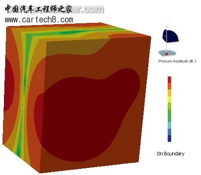 图7 某工况的振动辐射能量排序从分析结果来看,最主要的辐射能量来自于发动机缸盖以上的部分。除右侧外,其他的部位辐射能量都比较大,这与该发动机的进气歧管的布置有关。而油底壳部分,由于该发动机油底壳的刚度比较好,所以不是主要的辐射源。 4. 噪声预测 在将结构表面振动速度映射到边界单元节点上后,计算了发动机在一定频率范围内的结构辐射噪声。图8所示为500Hz的辐射噪声情况。场点取离发动机表面1m处的六面体。通过辐射噪声场的分析,可以明确该工况下主要结构辐射噪声频率及辐射表面,为结构优化指明了方向。
