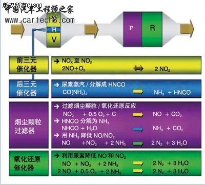 SCRi净化系统的结构和净化过程 发动机尾气后处理净化措施和闭式的烟尘颗粒过滤器是目前柴油发动机达标的标准配置方案,但是其他的技术方案同样也能有效地降低有害物质的排放。德国Emitec公司研发的开式紊流金属触媒催化器和永久再生技术,Emcon净化技术公司研发的可清除废气排放系统中残余的燃油并使得颗粒过滤器再生的废气蒸发器,以及HJS公司研发的利用“加热螺线管”提高废气温度的技术,都是一些很好的解决方案。 Emitec公司的SCRi净化系统 Emitec公司研发了SCRi净化系统。这是一种将颗粒过滤器、SCR三元催化器、NOX催化器以及尿素喷射系统组合在一起的废气净化系统。所有的催化器孔芯都带有金属膜,设计为开放式的紊流结构。其分流式低置过滤器保证了各种介质最佳的混和,产生的废气背压也很低,从而有利于降低燃油消耗。 NOX催化器能够清除废气中的NOX和CO。另外,Emitec公司还利用它尽可能多的从废气气流中生成NO2。所生成的NO2连续地使颗粒过滤器得到再生。在烟尘颗粒过滤器中,每一个孔芯都有极精细的金属纤维网。据Emitec公司介绍,这种烟尘过滤器可以清除大约60%~90%的微小颗粒。 除此以外,Emitec公司还向颗粒过滤器中喷射尿素,使废气中的有害物质转换为氮和水。为加速这一反应过程,在孔芯表面涂敷了一层TiO2材料的反应加速涂层。在氨的帮助下,后续的SCR选择性催化器能够把NOX分解为纯净的氮和水。 若在SCR选择性催化器后还有残留的氨,则可用一个盘状的氧化还原催化器将残存的氨转换为氮和水。依靠这一保障方式可以避免氨的泄漏,而且还可以将SCR选择性三元催化器制成很小的体积,整个SCRi净化系统的体积比传统的SCR三元催化器系统减小了25%~30%。 由于采用了先进的燃烧技术,柴油发动机排出的废气温度越来越低,而且越来越多的轿车配备了起步—停车自动装置,从而对催化器快速升温和烟尘颗粒过滤器连续过滤带来不利影响。因此,Emitec公司使用了金属材料的催化器机体,可根据需要进行电加热。 Emcon净化技术公司研发的废气净化蒸发器 Emcon净化技术公司研发设计了一种废气净化蒸发器,它对传统的颗粒过滤器的再生有着很好的辅助支持作用,对发动机在工作点、负载点的补充喷射有着很好的补充,能够防止在这些工况下出现混和气过稀的危险,帮助达到要求的排气温度。这些性能在短距离行驶或市内行驶是非常需要的。 为此,该系统用一个小型的泵从普通的燃油油路中取出一点点燃油,喷射到排气系统中,并用火花塞点燃,在NOX催化器之前再次导入排气系统,以提高废气排放温度。 据Emcon公司介绍:当车辆配备了下置式颗粒过滤器时,使用废气净化蒸发器可以节约大量燃油,与采用发动机设计技术提高温度相比,最多可减少50%的后续补充喷射燃油。废气蒸发过滤器可以通过发动机控制器进行调节。 HJS颗粒过滤器再生系统 HJS公司研发的是与Emitec公司类似的电动支持的颗粒过滤器再生系统。只是这家公司的颗粒过滤器再生技术不是直接再生。他们在催化器基体上设计了很多的加热线圈,依靠催化器基体的热辐射提高烟尘颗粒过滤器的燃烧温度。其前提条件是:烧结材料的颗粒过滤器,在陶瓷材料的颗粒过滤器中无法利用这一加热原理,因为陶瓷材料过滤器的通道没有相互关联的烟尘层。 为了加速烟尘的燃烧,HJS公司在柴油中添加了一种添加剂,使得烟尘燃烧的温度从600℃下降到400℃。在电气加热系统的帮助下,在发动机的各个工作点几乎都可以实现颗粒过滤器的再生。 |