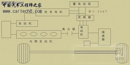 工作原理:混合动力系统主要有能源供给系统、电气驱动系统和机械传动系统三大部分组成:1)能源供给系统:由动力电池组、发动机-直流发电机机组组成. 2)电气驱动系统:由变频器和电动机组成. 3)机械传动系统:将内燃机和电动机的机械输出通过离合器和减速器送给轮轴. 如果电池组电量不足,则启动发动机通过直流发电机给蓄电池组充电,以保证有足够的能源供给.变频器控制电动机通过减速器及差动齿轮驱动前(或后)轮轴,内燃发动机通过自动离合器与电动机同轴安装(如上图所示).在车辆起动时或在市区内行驶时,只由蓄电池组通过变频器向电动机供电,即纯电动驱动;在公路上行驶时,离合器接通,由内燃发动机负责驱动轮轴,此时电动机作为发电机运行,通过变频器给电池补充充电;高速重负载行驶时,电动机与内燃发动机同时驱动轮轴,即混合驱动,以提高驱动功率,实现了节能与环保. 4 电动机控制系统 4.1电动机控制系统的组成