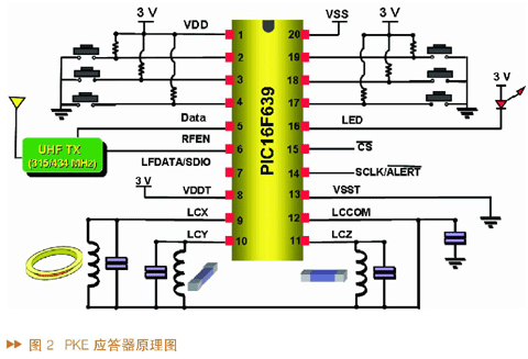 图2所示是PKE应答器原理图,图中的PIC16F639是由PIC16F636和MCP2030构成,其中MCP2032是模拟前端,PIC16F636是另外一个单片机,使用PIC16F636和模拟前端组合在一起主要是因为PIC16F636有Keylock加密解密的功能,如果使用者不需加密解密功能则可以使用2030模拟前端和其他的单片机组合。