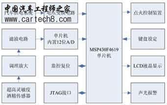 酒后驾车容易发生交通事故,为了减少或杜绝这种现象,通常是采用呼气酒精测试仪对驾驶人员进行现场检测,以确定驾驶人员是否饮酒。目前,市场上警用酒精测试仪种类繁多、功能强大、灵敏度高,但是由于它没有安装在汽车内部,只能由交警人员来实施,因此并不能从根本上杜绝酒后驾车,酒后驾车事件仍时有发生。 本文提出了一种基于MSP430单片机的超低功耗酒精探测控制仪,该仪器安装在汽车内,当驾驶人员进入驾驶室后,可以自动对酒精浓度进行探测,以确保行车的安全。系统可以根据检测到的酒精含量是否超标控制汽车点火器打开或者关闭,如果超标,则驾驶人员无法启动汽车,因此从根本上杜绝了酒后驾车的出现。该系统具有性价比高,智能化程度高,工作稳定可靠的优点。 系统工作原理 系统采用超高灵敏度酒精传感器,超低功耗单片机系统,自动探测酒精浓度的方法,可以防止驾驶人员逃避检测,以判断驾驶员是否是酒后开车,系统总体设计如图1所示。该系统可放置在汽车仪表盘位置,当司机发动汽车时,探测控制仪启动,此时发动机处于被锁状态,汽车无法启动。酒精传感器加热后,探测控制仪对酒精传感器探测的气体信号进行检测。由于酒精含量与酒精传感器检测后产生的电压信号成特定的比例关系,因而可根据电压信号进行酒精含量的判断。检测到的信号经过放大和滤波之后,通过单片机内置的12位ADC转换为数字信号,由单片机对此信号进行处理判断,假设酒精含量没有超标,LCD显示屏幕显示当前酒精浓度,同时正常指示灯亮起,控制继电器不起作用,汽车随之启动;反之,则进行声光报警,控制继电器切断点火装置电源,驾驶人员无法启动汽车,从根本上实现控制酒后驾车。汽车启动后,控制仪随即进入低功耗状态,只有酒精浓度探测电路一直工作,一旦驾驶人员驾驶过程中饮酒,控制仪立即恢复到正常工作状态。