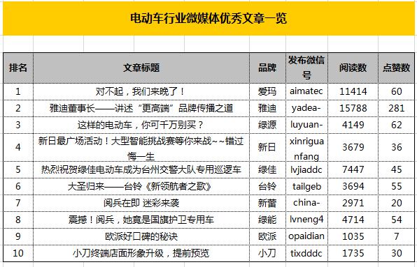 | 大家好!我是小辣椒,又到了公布电动车品牌微媒体EV指数周排行榜的日子了。 本期是EV指数周排行榜的第19期。从整体的数据来看,本期EV榜排名前四名的位置趋于稳定,但是电动车行业的微信关注度有所下滑。下面就让我们来看一下具体数据。 ![]() 榜单数据分析: 在本期排行榜中,爱玛重回冠军宝座,雅迪紧随其后,分数只差260。绿源新日与之相较还有一些差距,排在第三、第四。排在榜单第5位至第10位的分别是绿佳、台铃、新蕾、绿能、欧派和小刀。 一、四强稳定 本期的前三名位置分别由爱玛、雅迪、绿源、新日,回顾过往几期数据,这四个品牌位置基本保持稳定,一直占据前四名的位置。 综合分析这四个品牌的微信平台文章发布规律,可以发现这四个品牌,在文章发布的数量,质量上都相对比较稳定。以爱玛为例,爱玛每周有10篇以上文章推送,每篇文章的阅读量都能到达1000以上,所以总阅读量会比较高。而同样的,新日每周的发文量也都控制在15左右,发文量的增长带来的是阅读量的增多。相对来说,雅迪的发文量虽然较少,但是文章内容质量较高,每周都10000以上的稿件出现。 二、第二阵营厮杀激烈 相较于第一阵营的稳定,EV榜第二阵营的竞争非常激烈,整体排位有了巨大变化。同时绿佳、新蕾在本期EV榜上表现尤为突出,阅读数和点赞数相较上期都有很大的进步。而小刀也重新杀回前十,也给本期榜单带来一些惊喜。 三、爱玛高调回归榜单第一 爱玛本周回到到第一名的位置。通过对爱玛公众平台所发布的文章进行分析,多以宣传旗下新品车型为主,但是宣传方式多以图片为主,并且结合了时下热点,比如阅兵,比如一些网络流行词汇,准确的迎合了时下年轻人的心态,吸引了大批粉丝的关注。 微信公众号作为电动车一、二线品牌官方传播渠道,是一种行之有效的方式,文章发出后传播速度快而且成本低,效果也比较明显。下面附上电动车品牌微媒体优秀文章一览表,仅供行业人士参考。 ![]() 行业品牌微媒体EV指数周排行榜是电动车时代网数据研究中心以微信平台为数据来源,面向各电动车品牌在微信平台所发布的文章数量及质量而做出的统计,将于每周三发布上一周数据,敬请关注。 |