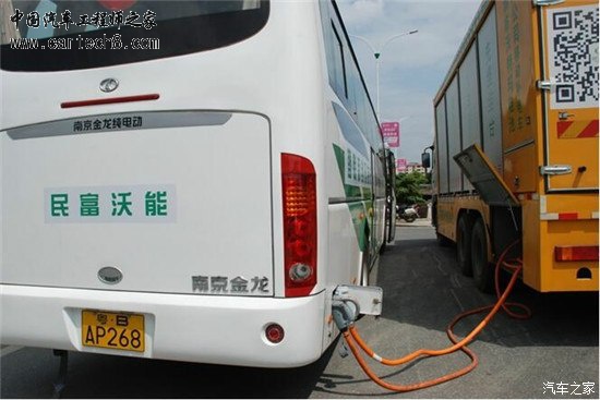 与之功能相似的,是深圳民富沃能新能源汽车有限公司推出的一款叫做民富-东风纯电动的移动补电车。据其官网介绍,此款车总装备质量16吨,电池重量为8吨,采用的是沃特玛24V磷酸铁锂电池,电池满电能量为550kWh,大小如同大型卡车。该公司相关负责人表示,这款移动补电车可在无法建设充电桩或在电网维修改造及充电设备故障的情况下,作为分布式储能电源或应急电源,随时为电动汽车提供应急充电,目前主要应用于纯电动大巴上。移动补电车一般利用峰谷时段进行自身充电,白天运营时,司机可随时根据耗电情况,在起、终点站中利用调度和休息的8~10分钟时间,使用双枪对公交车快速补电,快补10分钟至少能续驶40公里。