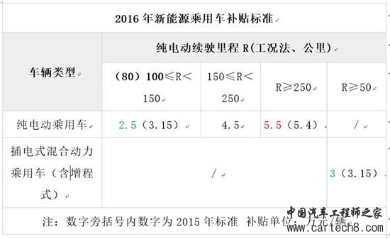 | 2016年还未到来,但2016年新能源汽车产品国家补贴政策已经出台了。按照此前财政部、科技部、工业和信息化部和发展改革委联合公布的《关于2016-2020年新能源汽车推广应用财政支持政策的通知》,新能源产品的政府补贴力度,将逐年降低,而2016年的标准显然执行了《通知》的政策要求。对于企业来说,在逐步缩减的政府补贴背景下,只有依靠核心技术,才能保证自己的新能源产品立于不败之地。 2016年新能源乘用车补贴力度继续降低 根据2016年新能源乘用车补贴标准,纯电动产品的补贴门槛被进一步提升,纯电动(下称EV)和插电式混合动力(PHEV)产品的补贴额度也有了不同程度的调整,具体数据可参考下表。