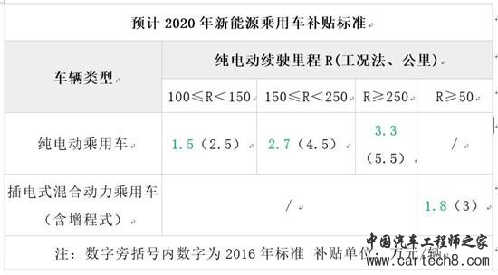 新能源政策支持退坡 掌握核心技术成关键 从上表中可以看出,EV车型的补贴门槛从80km的续航里程提升到100km,而入门档次,即100-150km续航里程车型的补贴标准从2015年的3.15万元/辆降低到2.5万元/辆,补贴额度降低20.63%;续航里程大于250km的产品补贴标准从5.4万元提升至5.5万元,增幅仅为2%。与此同时,PHEV车型的补贴额度从2015年的3.15万元减少至3万元,降低了5%。 而根据《通知》要求,2017-2020年除燃料电池汽车外其他车型补助标准适当退坡,其中,2017-2018年补助标准在2016年基础上下降20%,2019-2020年补助标准在2016年基础上下降40%。据此,假设续航里程标准不变的前提下,我们制得下表。
