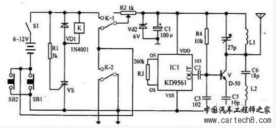随着环保意识的增强,电动车已大量进入我们家庭,成为部分人必不可少的交通工具。如何防止电动车被盗则是车主十分关心的问题,为此,出现了各类电动车防盗锁。然而,电动车被盗现象仍层出不穷,较高级的电动车防盗锁在短时间内难以破坏,盗贼便将电动车搬上其它车辆上盗走,这样,再高级的防盗锁也显得无能为力了。鉴于此,我们为大家介绍一款电动车防盗报警器电路图。 报警器发射机部分是由继电器K和可控硅VS用来控制发射机电路的电源。IC1组成警声信号电路。晶体管V及其外围元件组成射频振荡电路,发射报警信号。 在等待状态时,开关S1接通,而SB1断开(即车头锁被锁住),K就处在释放状态,报警发射机不工作。当车头锁被打开时(即SB1接通),VS 被触发导通,K吸合,接通发射机电源。SB1接通后,K-2的常开点将其自锁,此时只有断开S1报警方能结束。在K动作时,其常闭触点K-l断开,切断发动机点火电路。 接收机电路由TDA7010和开关功放TWH8778、TWH68组成。当IC2 收到报警信号时其互脚的高电平通过IC3经IC4放大由TWH15放出报警声。但要考虑到频率的稳定性,因为7010自身没有频率稳定电路,在工作时要多作检测,最好用印制板和贴片元件。 按上述操作方法停放车辆后,报警器即进入待报警状态。在待报警期间,只要有人无论用什么方法打开车头锁或搬移车辆,都将触发报警器报警不停,并切断发动机电源使车辆无法起动,直至车主人赶来将点火钥匙插入点火锁内转到关的位置,报警才能解除。 |