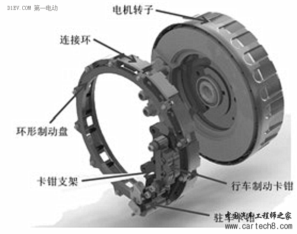 双定子轴向磁通轮毂电机驱动形式 制动集成技术 轮毂电机安装在驱动轮的轮毂内,占据了原来布置机械制动卡钳与制动盘的空间,导致无法沿用原有的机械制动器。若仅靠轮毂电机的电回馈制动,存在制动力不足、电池剩余电量不足时无法实现电回馈制动、制动可靠性较低等问题。目前轮毂电机已有了机械制动的集成方案,但该方案并不成熟,所采用的环形制动盘制制动力臂大,摩擦片制动面积小,存在易变形、抖动大、发热量大等问题,其制动能力及可靠性仍有待验证。