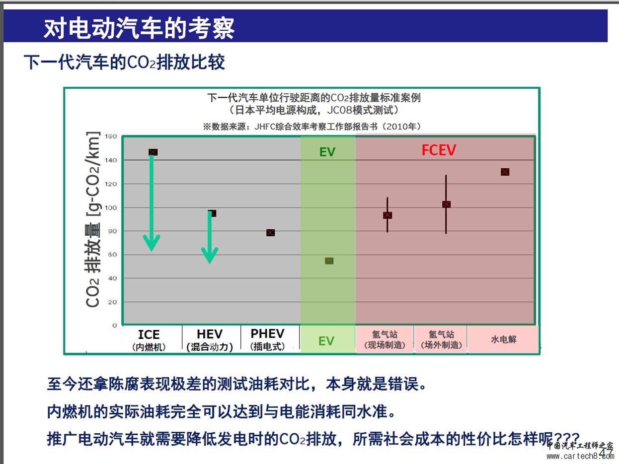 电动车真的“没有意义”? ——车市热点问答(76) --------------------------------------------------------------------------- 如果把C级车的油耗降低25%左右,达到3.9升/100公里,就可以达到与电动车同等的减排效果(116克/公里)。电动车的发展应该全盘规划、循序渐进,与电力结构的改善、充电基础设施建设以及市场需求相协调,远离“大跃进”式的浮躁,才能真正达到节能减排的目的。 ------------------------------------------------------------------------- 最近,新能源汽车市场堪称冰火交加,一方面北京长城华冠汽车科技股份有限公司旗下的全资子公司前途汽车(苏州)有限公司举行生产基地奠基仪式,号称是“中国首款纯电动超跑‘前途K50’量产在即”,还有乐视与阿斯顿马丁成立合资公司,将合作研发并生产一系列互联网智能电动汽车,都给电动车火上浇油;另一方面,1月份中国新能源汽车产销出现环比“断崖式下滑”,且爆出电动车销售“骗补”丑闻,而马自达创驰蓝天技术之父人见光夫一句“电动车几乎没有意义”更是语惊四座,都给电动车泼了冰水。以往,电动车热的一面已经让人过分热血沸腾,如今,冷的一面开始受人关注。 问:听说此次在广岛举行的“马自达技术论坛”上,马自达创驰蓝天技术之父人见光夫宣称“电动车几乎没有意义”,而且做了详细论证,对在场的几十家中国媒体有着振聋发聩的效应。您怎么看? 答:其实,人见光夫的说法并不新鲜。5年前,大众中国前总裁、新能源汽车专家倪凯铭(现任欧宝汽车公司总裁)就曾说过,在动力相等的情况下,一辆1.4TSI的高尔夫每公里二氧化碳排放量(包括从油井到成品油生产过程中的二氧化碳排放)为143克,而在中国,主要依靠煤电的纯电动高尔夫虽然车辆本身显示的是所谓“零排放”,但每公里消耗的电量在发电过程中的二氧化碳排放则高达171克。 不同的是,倪凯铭没有给出“电动车几乎没有意义”这样的结论,貌似是要让人们自己得出结论,而人见光夫是一个纯粹的工程师,直截了当地把自己的想法说了出来。 问:他的根据是什么? 答:人见光夫的算法跟倪凯铭不一样,他是按世界现有电力结构发电的二氧化碳排放平均值来计算的——每发1度电产生的二氧化碳排放为0.5kg(500克),即:如果一款欧洲官方标准的C级电动车(相当于我们熟悉的A级车或紧凑型轿车)每百公里耗电21.2度(或每公里耗电0.212度),那么,按这一平均值换算成每公里的二氧化碳排放为106克/公里(或10.6kg/100公里),考虑到锂电池的生命周期,每公里还应该加上10克,就是116克/公里。 而搭载马自达创驰蓝天技术的C级车,在动力与电动车相当的条件下,实际油耗为5.2升/100公里,如果按马自达“从油井到车轮”全程二氧化碳排放换算公式(油耗公升数*2.85)计算,二氧化碳排放是148克(或14.8kg/100公里);按所谓国际公认的换算公式(油耗公升数*2.7;中国标准的换算公式为油耗公升数*2.254,没有考虑从油井到加油站国产的二氧化碳排放)计算,则相当于140克(或14kg/100公里)。也就是说,如果把C级车的油耗降低25%左右,达到3.9升/100公里,就可以达到与电动车同等的减排效果(116克/公里)。 问:中国电力中煤电比例高达80%,平均二氧化碳排放量更高,计算的结果也会有所不同吧? 答:按人见光夫给出的数据,中国鉴于现有电力结构和发电效率,目前每发1度电产生的二氧化碳为0.77kg(770克)。我算了一下,如此一来这款马自达电动C级车在中国行驶时,每公里二氧化碳排放就高达163克,如果加上锂电池生命周期的因素还要加上10克,就是173克,和前面倪凯铭的数字(171克)差不多。 换句话说,在中国,一款汽油车行驶100公里的油耗如果是6.0升,每公里二氧化碳排放就是173克(17.3kg/100公里),与一款同等动力和级别电动车的二氧化碳排放相等。那么,有多少C级车(紧凑型轿车)已经达到了中国特色的电动车排放水平呢?我粗略统计了一下,除多款丰田、雷克萨斯混合动力车型(注意:不是需要充电的插电式混合动力)外,奥迪、宝马、奔驰、别克、雪佛兰、大众、马自达、斯柯达、福特、吉利、比亚迪等品牌,都有工信部百公里油耗在5.1-6.0升的C级车(紧凑型轿车)。它们是不是也该享受电动车的补贴呢? 问:看来,人见光夫“电动车没有意义”的说法还是很有道理的。 答:但要注意这中说法的前提是“如果按照现在的发电方式进行计算”。换句话说,如果发电方式改变了,“肮脏的煤电”被淘汰或改善了,发电的二氧化碳排放大幅减少到超过内燃机节能减排的极限值,电动车就变得“有意义”了。 国务院已经决定要坚决淘汰落后的煤电产能,实施燃煤电厂超低排放和节能改造,大幅降低发电煤耗和污染排放。这才刚刚开始,要从目前每度电0.77kg的二氧化碳排放降到0.5kg的世界平均值,还需要不短的时间, 所以,在目前及相当一段时间内,搞“电动车大跃进”除了要解决代价高昂的基础设施配套和价格补贴等问题外,就算有再多的人使用电动车,节能减排的实际效果也可能不如推广新技术发动机来得实在。电动车的发展应该全盘规划、循序渐进,与电力结构的改善、充电基础设施建设以及市场需求相协调,远离“大跃进”式的浮躁,才能真正达到节能减排的目的。 问:说到内燃机节能减排的极限,估计还有多大余地?技术上能达到吗? 答:人见光夫认为,内燃机热效率改善余地还有30-40%。马自达第三代创驰蓝天技术将比目前的第一代进一步降低油耗3