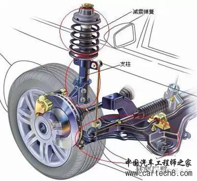 上图中弹簧的作用是在车架和车桥之间作弹性联系,承受和传递垂直载荷,缓和不平路面带来的冲击;悬架摆臂是一种导向装置,用来传递纵向力、侧向力及其力矩,保证车轮相对于车架或者车身有一定的运动规律;支柱上边就是减振器,主要作用就是加快振动的衰减,限制车身和车轮的振动。