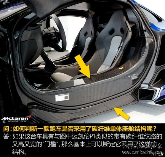 正因为CFRP的身价不算特别亲民,所以以往只有那些身价数十万美金(国内售价数百万人民币)的超级跑车才能消化其高昂的成本,而一些超级跑车不仅大量使用CFRP制作车身部件,而且还用这些昂贵的材料做成了一个整体的座舱架构,也被称为碳纤维单体座舱。如果有人告诉你他的跑车使用了碳纤维单体座舱结构,有两种可能:1.他在吹牛*;2.他是个壕;3.还有一种可能,我们稍后再聊。