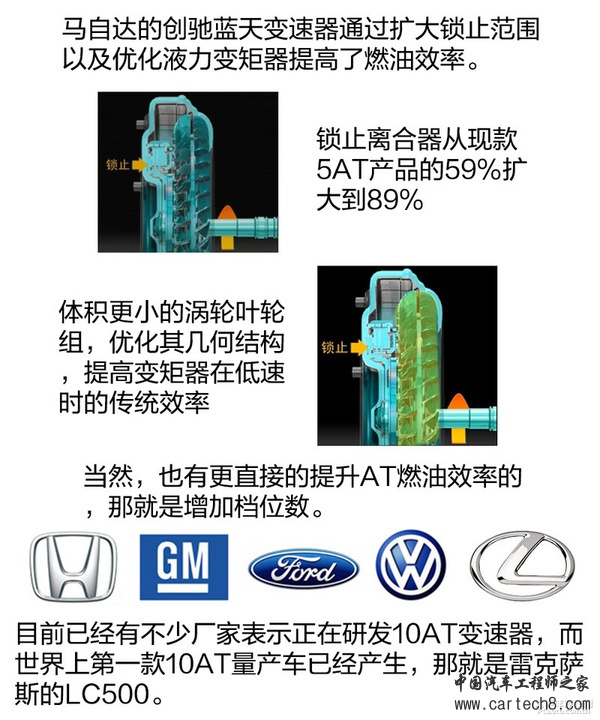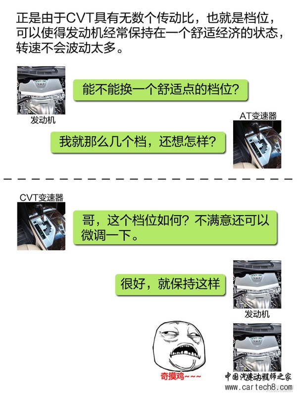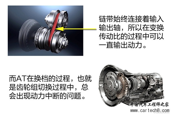 | 得益于日产几乎全车系的CVT化,人们对CVT变速器逐渐有了更多的认识,而大家对CVT最为熟知的一点就是省油。坊间对车有点了解的人都知道,现在的CVT要比AT省油,然而,这是真的吗? [tr] [td] [/td] [td] ● 写在最前 ● CVT&AT的原理 普通的AT是通过齿轮来改变传动比的,有多少个档就有多少组传动比,需要什么传动比就选择什么档位。 然而,普通的AT是有档位数的,例如4档、5档、6档、7档等等。他们之间的切换如果举个例子就好像我们上楼梯一样,一级一级变化。 而CVT,也就是无级变速器,是通过两组锥轮控制金属链带,通过改变链带两端的直径大小实现传动比的变化。 文字怎么表达,还是没有视频直接,要更进一步了解CVT的工作原理的朋友可以点击以下视频: 既然说到这里,不妨再扯远一点,因为链带的变化是连续没有中断的,其两端直径变化也是呈线性改变的,所以CVT也因此而平顺(当然,国内很多自主品牌的CVT由于匹配问题,很多都会出现顿挫问题,驾驶起来完全不像是CVT的感觉)。 ● CVT比AT省油? 不要问我为什么要以杰德为例子,因为同一款车型同时配置CVT以及AT变速器的例子并不多。 从工信部的油耗测试来看,同款车型,配备CVT的会比配备AT的要省油,为什么会有这样的后果呢?CVT究竟有什么节油魔力?下面我们一起来看看。 ● CVT动力输出连续 CVT相比于普通的AT,动力是一直保持输出的,没有中断过。而AT在换挡时动力是中断的,虽然动力中断时间目前已经可以做到很小,大概是0.0几秒,但终究还是造成动力流失了。从这个角度来看,CVT有效地利用了动力,也是省油的一个原因。 ● CVT使发动机常保持在经济状态 由于CTV实际上是有无数的档位,也就是可以有无数的传动比可以按需调节出来,以加特可的最新的CVT8无级变速器为例,这个CVT拥有最大为7.0的传动比,那么,理论上来说,这个CVT就可以随意调节出0-7.0以内的传动比,以供车辆的行驶需要。 开过手动挡的朋友也知道,有些时候挂高一个档位动力太弱,低一个档位转速又高了,这时如果有个中间档,像3.5档就好了。 也因为这,发动机能够维持在一个经济舒适的状态,也没有太多的转速波动,相当于车辆在匀速行驶,这样的话,省油就很轻易实现了。 ● 关于CVT的传动效率 CVT其实有很多好处,但也有一个很不好的地方就是会打滑。我们都知道,CVT上的金属链带是通过锥轮夹紧来传递动力的,但由于不是100%的刚性连接,所以有时候发动机急加速时,锥轮就有可能无法夹紧金属链带,造成打滑。不过有一点我们要知道的是,如果真实中的CVT链带和锥轮之间发生打滑的话,变速器早就被烧坏了,实际上在链带和锥轮之间发生相对滑动(这个滑动相当小)达到足以损坏变速器的时候,电子系统就会让发动机罢工,停止或者减少动力输入,保护变速器。 , 从这个角度来看,CVT的效率其实是比AT要低的,但事物要看整体,因为CVT经常让发动机处于最经济的状态,所以效率不高也可以创造出低油耗。 但我们也需要知道,传统的自动变速器(AT)也在时刻发展着,很多厂商依旧对AT不离不弃,一直在深挖AT的潜能。 ● 总结 CVT比普通AT省油,原因其实并不会有多复杂,归根结底就是CVT一直让发动机处于舒服的状态,保持在经济的转速。不过CVT也有相对劣势的一面,那就是打滑,但满足家庭使用还是没有任何问题的。不过,科技日新月异发展,很希望CVT能够解决自身的不足,将省油平顺的优势发扬光大。 |
