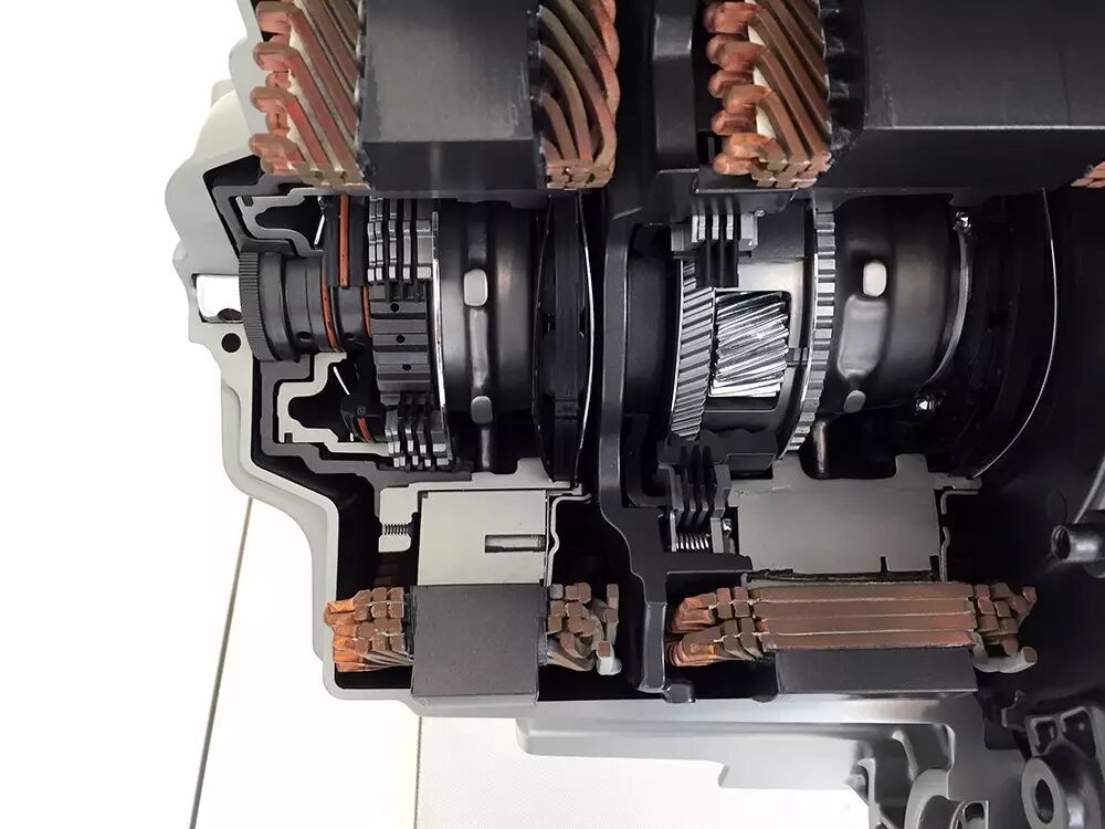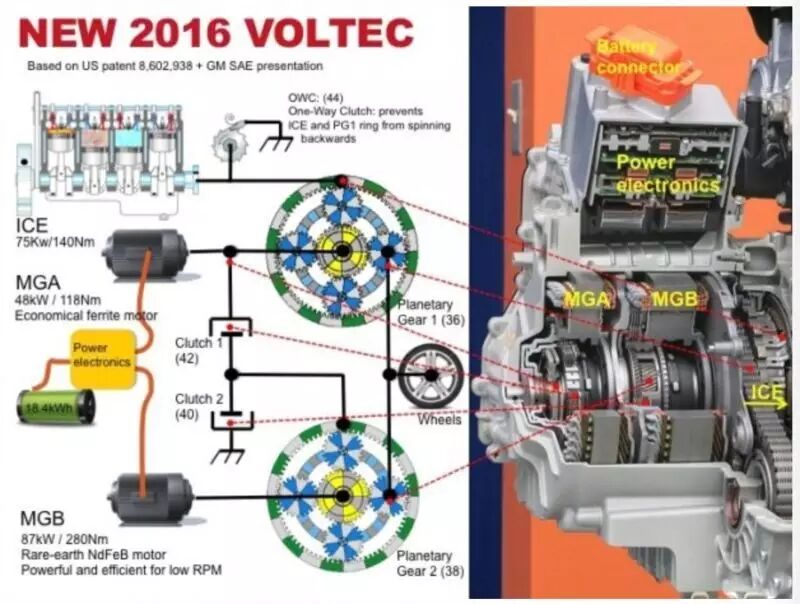 这套变速箱高度集成了两个电动机、逆变器等,最重要的还是采用了两个行星齿轮组,用两个离合器(一个固定、一个运行)调整混动力工作模式。众所周知的是,丰田只采用了一个行星齿轮组,弊端是发动机和电动机无法保证同时在最佳工况时工作,而全新VOLTEC采用两个行星齿轮,就可以达到这种效果。