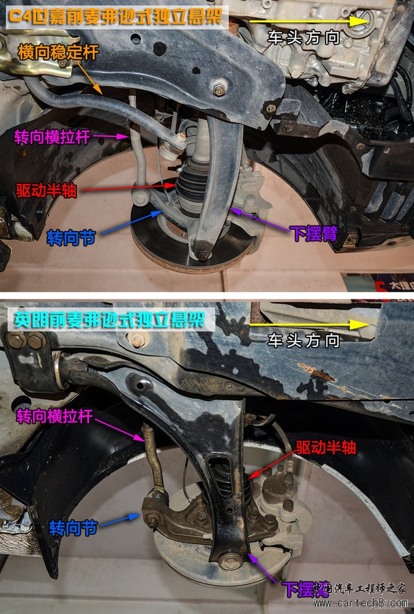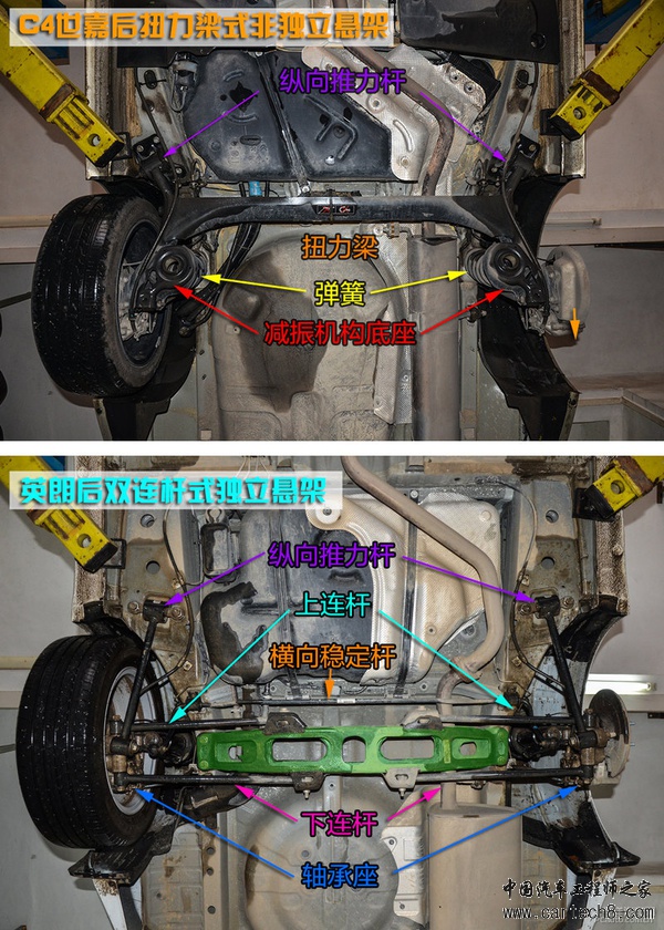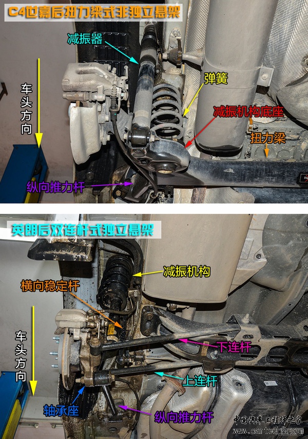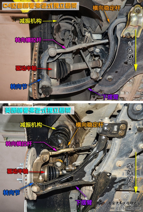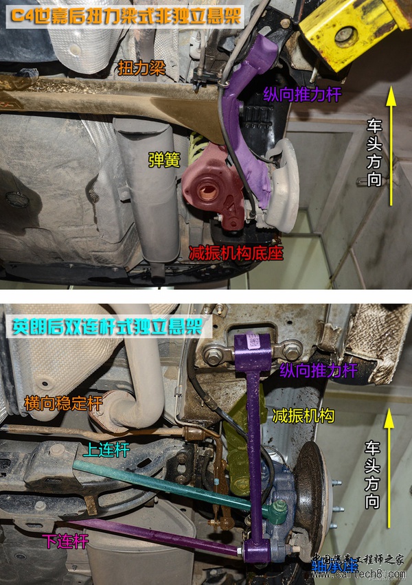 1底盘一览和前悬架及细节对比回顶部 【太平洋汽车网 技术频道】自从开始用车答疑的环节,很多网友都问我,“15万元落地买哪款三厢车好?或裸车在10万左右,不要日系的,行驶开起来一定要超稳的,最好是欧美品牌”。显然这条问题也是代表着众多国人首次购车的心态,既要有体面,又要空间大,还要开起来有乐趣。既然这么多要求,有没有车能达到呢?显然车厂也是机智的,来个适合中国国情特供车来应对国人的苛刻要求。下面找来了东风雪铁龙C4世嘉与上汽通用别克英朗进行裙底探究,看看哪款车更加适合国人使用。 ● 底盘一览 东风雪铁龙C4世嘉与上汽通用别克英朗同属一个级别的车型,两车从底盘布置上几乎非常接近,结构布置也是非常紧凑,都可大致分为车头部分、前悬架以及副车架、中央纵梁部分、油箱、后悬架与副车架、尾箱部分。前悬架两台车都采用了麦弗逊式独立悬架;后悬架部分则有所不同,C4世嘉采用的是可变截面扭力梁式非独立悬架,而英朗则采用双连杆式独立悬架,当然这仅是悬架的形式最终表现还是要考调教功力的深厚。不过C4世嘉排气管经过之处都有隔热瓦进行隔热,英朗则只是小部分。这一点无疑是C4世嘉做得更好。 ● 前悬架及细节对比 C4世嘉和英朗都采用这个级别常见的麦弗逊式独立悬架。减振器与弹簧都采用一体布置。两车的横向稳定杆通过小连接杆与减振器下方进行链接,相比连接下摆臂处更能给抑制转弯时的侧倾。想象下在转右弯时,左侧车身下沉,右侧车身上扬,车身上下浮动主要体现在减振机构上,横向稳定杆连接在减振器上可以抑制左右上下浮动(侧倾)的出现。 虽然两台车的前悬架结构一致,但细微的差别还是存在的。下摆臂造型就有着差别,C4世嘉采用的是“L”字形的,而英朗则为普通常见的“Y”字形。L字形下摆臂比Y字形受力长度更长,导致力臂增长,路面传递的震动至车身可稍微减缓。 横向稳定杆纵向布置的位置也稍微有所不同,C4世嘉布置得较为靠后,位于转向横拉杆之后;英朗则在转向横拉杆之前。两者差别主要体现在抑制侧倾方面,横向稳定杆长度越短抑制能力越强。同时两车下摆臂与转向节(羊角)的链接采用带防尘套的球头铰链链接,并没有采用独立的球头链。 副车架上两台车也是有着较大的差异,C4世嘉采用的是“H”型的副车架,与同级别主流车型一致,其副车架采用的双层钢板冲压焊接而成的,发动机下机脚通过橡胶衬套与副车架相连。英朗则采用的是全框式车架,虽然对车头的支撑性好,但整体质量较重,导致车头重量增加,惯性增加,降低转弯时的灵活性。同样英朗的下机脚也是采用橡胶衬套与副车架链接。 对于大伙热议的转向节用什么材质的问题,其实一般家庭用车更注重的是可靠耐用性以及维修成本,一味追求更好材质或更高级的工艺并不是理性的选择。C4世嘉的转向节采用了更加可靠的铸铁材质,保证刚度的同时又能降低维修保养成本。英朗则采用铸铝合金,虽然可轻微降低簧下质量,但刚度不如铸铁的。 由于两车的下摆臂造型并不一致,导致下摆臂的工艺也有所差异。C4世嘉的下摆臂采用双层钢板冲压焊接工艺,同时下摆臂通过两点的橡胶衬套的螺栓链接与副车架相连,能适当消灭路面的细微震动。英朗则采用单层钢板冲压的下摆臂,与副车架一样采用了橡胶衬套。单单从两款车的下摆臂上是无法断定哪款车好,哪款车差,毕竟调教还是占到非常重要的分量。 如果您想了解更多汽车技术相关的知识,请到技术频道! 2后悬架及细节对比回顶部 ● 后悬架及细节对比 C4世嘉采用了扭力梁式非独立悬架,同时也布置了横向稳定杆在增强扭力梁的抗扭刚度,整体结构较为耐用。英朗则采用较为复杂的多连杆式独立悬架,准确来说是双连杆式独立悬架,也就是大多数心里所想的“筷子悬架”。即便如此双连杆也是独立悬架,两侧车轮的跳动互不影响。 两车后悬架的差异往往反映着国人购车的顾虑。C4世嘉的扭力梁式非独立悬架看似比英朗的双连杆式独立悬架稍微让人觉得单薄些,其实并不然。C4世嘉的采用了减振器与弹簧分离的布置,减振器的长度受到车身结构影响较小,可以设计较长的缓冲行程来减少震动,其滤震效果也能达到不错的表现。英朗的后独立后悬架的确面对不平路面能有着更加细腻的过滤。不过由于其纵向推力杆偏细,抗纵向的冲击能力较弱。如此的布局会造成稳定的制动前束,但驱动时的前束变大。 C4世嘉的扭力梁远离后轮的轮轴,扭力梁主要受到轮子施加的扭转力矩作用,距离较长的力臂能减少震动和力传递至车身。其减振器和弹簧设定偏舒适性,扭力梁也能适当抑制侧倾。英朗的双连杆采用的是不等长的连杆,车轮上下跳动是沿着车架点作旋转运动。减振机构角度倾斜较小。 由于扭力梁式非独立悬架主要由扭力梁抵抗扭转变形,因此无需布置副车架来增加刚性,从而导致簧下质量有所减轻。不过英朗后悬架的副车架也是相当紧凑,没有多余的部件。两车的纵向推力杆与车身链接处都采用了橡胶衬套链接,可适当减轻路面震动带来的不适。 3底盘其他细节对比和总结回顶部 ● 底盘其他细节对比 ● 总结 C4世嘉实际表现的确超乎想象,底盘非常稳定,且相当有韧性,与欧洲车调教非常相像,但却不失去舒适性。相比英朗,虽然舒适性能让人舒服睡一觉,但要激烈驾驶却让人信心
