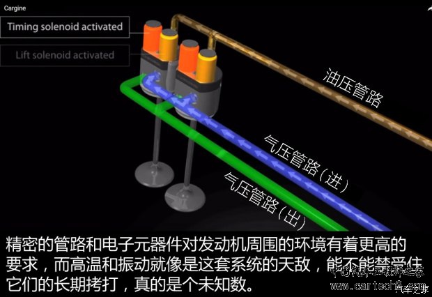 ★ 担心:看起来很美,但仍需时间检验 每个气门模块是由两个气路和一个油路来控制的,气路负责将其气门打开至相应的位置,而油路决定着气门打开的时长。 由于这些“管路”都是十分精细的,这就对流通于中间的油液和气的纯净度有着非常高的要求,抛开气路不谈,如果油液不纯净,那么就会很容易对油路造成堵塞,从而造成模块的损坏。 还有,这套系统中有大量的电子元器件,这些部件对环境是极为细腻、敏感的,而缸盖的又是热量较为集中的地方,这些热量对势必会这些精密的电子元件产生一些影响。虽然,科尼赛克已经做了55000km的测试,但是这对于量产的标准来说还远远不够, 写在最后: 将原厂动力提升45%、扭矩提升47%、油耗降低15%、重量减轻25kg、体积缩小,这一连串的数据,让这台发动机在账面上面看起来真的很美,但是较短的测试里程,以及犹如“小白鼠”一样的现状,不禁让人们对它未来的可靠性产生疑问。 此外,一辆汽车的动力总成中,不仅要有漂亮数据的发动机,还要有能最大发挥发动机效能的变速箱,而在观致身上,对于变速箱的标定好像是一个不小的难题,起码在观致5身上看起来是这样的(点击查看观致5评测文章)。 而这项技术能不能扭转观致汽车略显惨淡的销售业绩,恐怕连观致自己也会打一个大大的问号。技术说明会上,科尼赛克方面也指出了这项技术在初期的成本并不便宜,而这些都是观致需要面对的问题,如果观致真的使用了这项技术,那么效果真的只能靠时间来检验了。 |