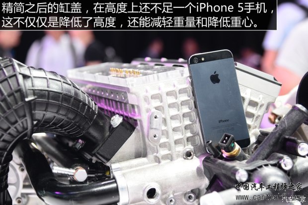 2.体积更小、重量更轻。 这台发动机最直观的特点就是小巧,如果您环顾整个车展,这台发动机应该是同排量中体积最小的。由于没有了“传统”的配气系统,这台发动机相比原来轻了25kg,也使得高度和长度分别降低了70mm和50mm。