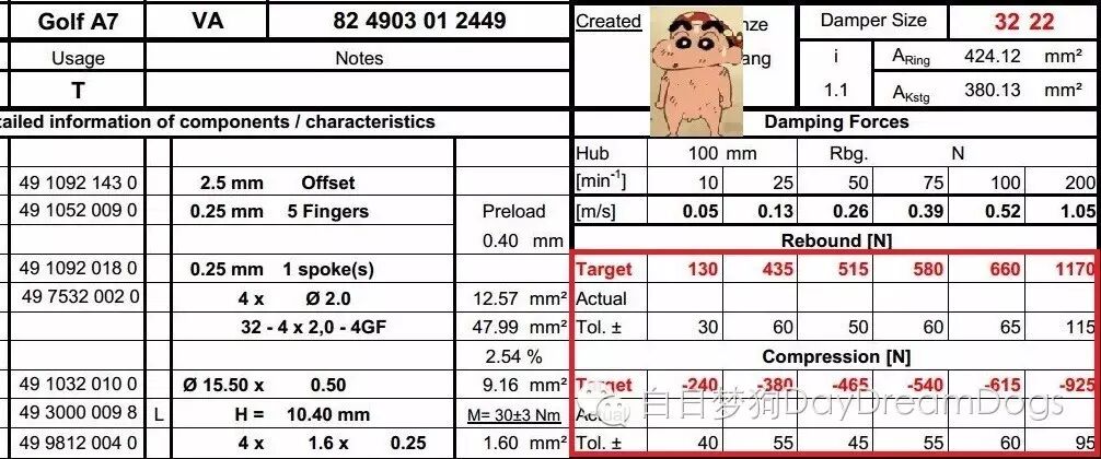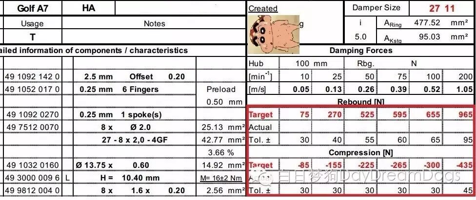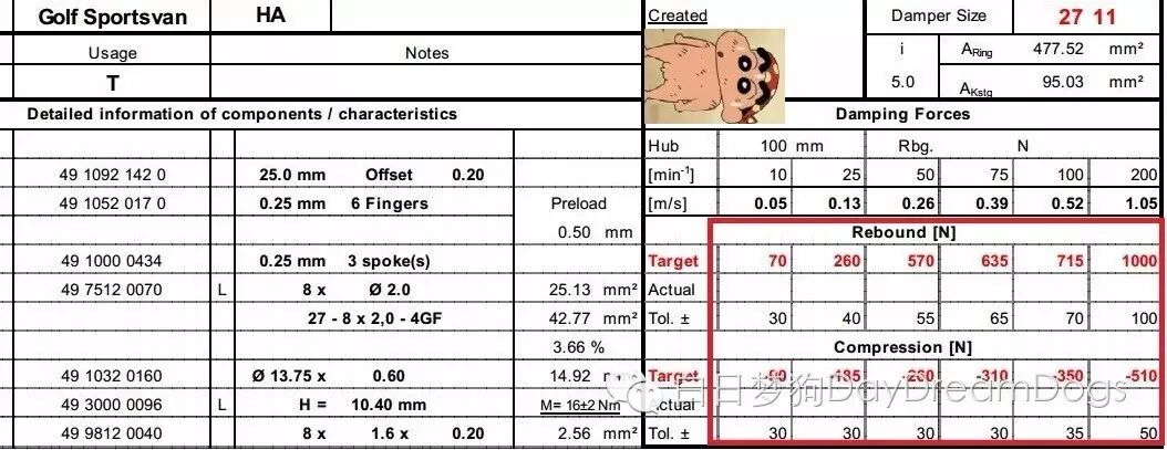 真坑爹啊!大众太懒了。经过和工程师确认,高尔夫前减振器和高尔夫嘉旅的调教是一模一样,包括所用的零件数量、尺寸、重量都是一样的。故用一张Setting(调教)表。在上图红色框内的力值,就是高尔夫和高尔夫嘉旅在汽车上下振动6种递增速度下的力值表现。按照行业内来说,这种力值的调教是偏软的。(新A4L的复原力值最大可达到3000N)