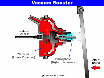 别急别急,这跟刹车助力的关系可大了,我们先来看下刹车系统真空助力器的原理: 动图 不好意思,gif图只能找到英文的。画面右边的棒棒就是刹车踏板,真空助力器的红色的左半部分与进气歧管相连接,而绿色的右半部分与大气相连接。 在平原上,由于节气门体的节流损失(可以理解为节气门关着,但活塞在不断地抽取进气管里的空气),进气歧管中气压很低,于是真空助力器左侧气压也很低,而右侧是大气压,于是就依靠压力差帮助司机踩下刹车,起到助力的作用。(熄火后,进气歧管气压恢复为大气压,所以刹车会失去助力,所以千万不要熄火滑行) 在高原上怠速时,一方面节气门体开大,特别是打开空调、风扇、大灯等负载时,从而进气歧管压力较高,另一方面右侧连通的大气压力降低。这样一来,真空助力器的力气就小了,刹车也就会变硬。 因此,高原上需要检查空挡怠速时的制动性能,如果发现制动力不足、制动性能不满足要求,则需要加装电动真空泵,来对真空助力器左侧主动抽真空,提高助力,虽然这是一笔不小的成本,但为了安全考虑,却又是不得不花的成本。