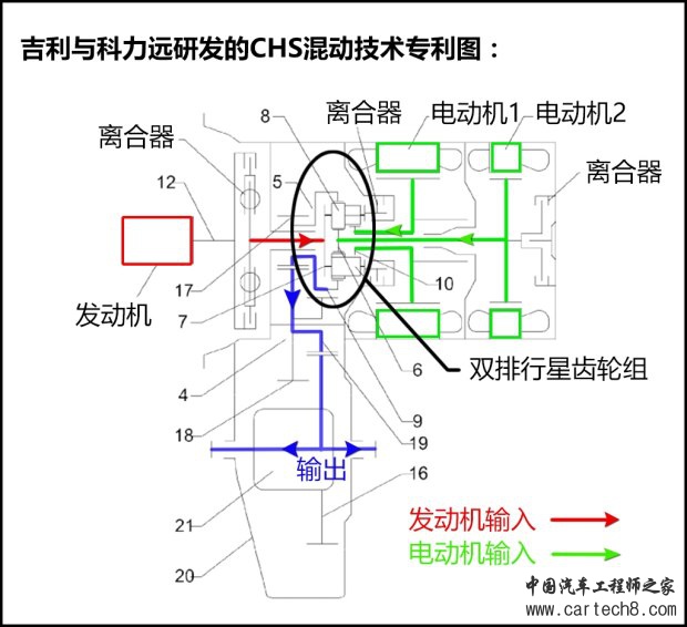 除此之外,我们在国家专利局的网站上看到了吉利申请了这样一个专利,简单的说其本质上与丰田的混合动力没有太大的区别,而唯一的特点是吉利通过一套双排行星齿轮组(丰田的动力分配机构为普通单排行星齿轮组)以及离合器的增加,绕过了丰田的技术专利。