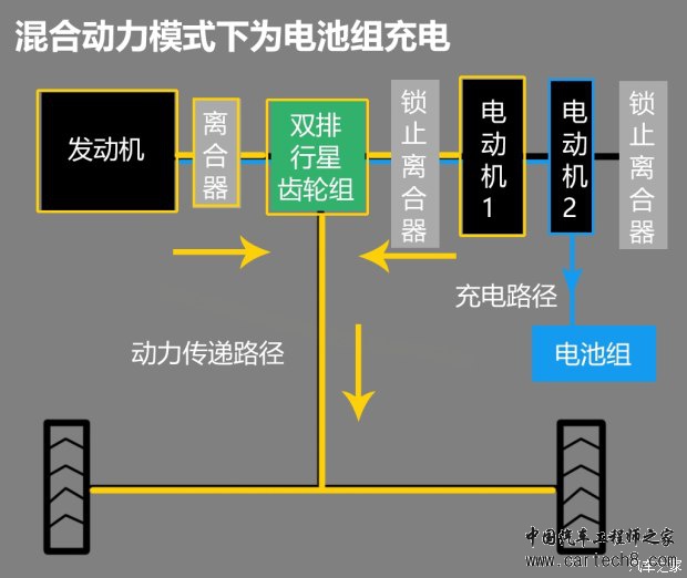 - 如何在行驶中为电池组充电? 发动机运转起来后,不仅能够进一步提高车速,而且根据行星齿轮的扭矩分配原理,在电池组电量不足时,一部分多余的扭矩还能够为电池组充电。没错,此时的电动机2又发挥了它的第三个职责——发电机。发动机不会随时都为电池充电,前提是发动机保持在燃油经济性最佳的转速区间里,额外的能量才会补充到电池组内。
