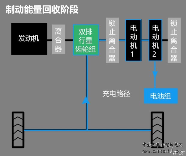 3、制动能量回收阶段 在车辆减速制动时,这套混合动力系统会通过电动机1和电动机2共同将动能回收到电池组内。