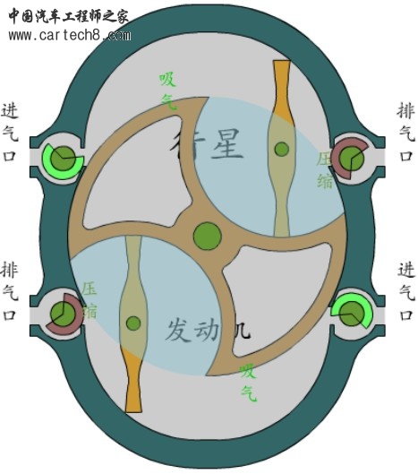目前汽车大多用的是往复式发动机,三角转子发动机是一个很好的发明,可惜由于自身的原因一直没能大范围应用。我来介绍一款行星发动机。它的优点是体积小,正常情况下与现有往复式发动机相比,每升的功率提高一倍。并且配气简单,体积至少缩小一半。我做了动画http://flash.qq.com/cgi-bin/viewwork?id=894222请欣赏。http://flash.qq.com/cgi-bin/viewwork?id=894222